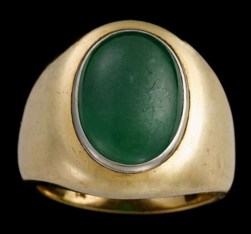 Oval cabochon cut jadeite, approximately 6.89 carats. Bezel set in polished gold.