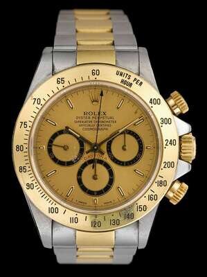 Stainless steel cased yellow gold tone face with dash dial signed by the maker, 30 minute and 12 hour dials, tachymeter bezel, automatic movement. Stainless steel screw down case back. Two tone Oyster link wrist band with clasp deployanr. Accompanied by original box.