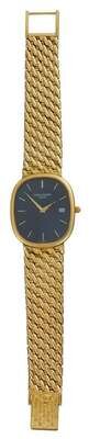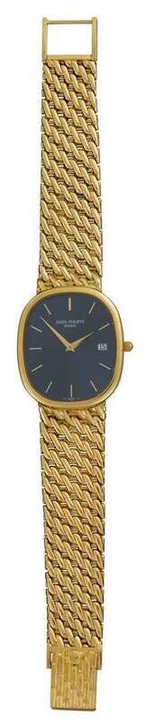 Oval blue tone face featuring dash dial, displaying date window, signed by the maker, automatic movement. Reference no. 3747/175, movement no. 1584195, case no. 2884404. 18 karat original woven gold bracelet. Clasp displaying hallmark and maker marks.