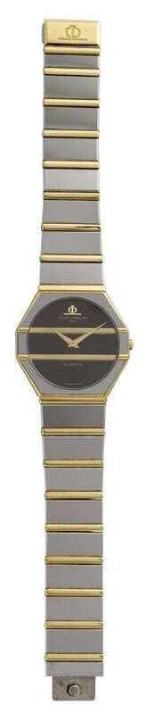 Stainless steel octagonal case, round black enamed blank face, signed by the maker, quartz movement, paneled flexible stainless steel and gold filled link wrist band, serial no. 5118DJ81327410, accompanied by Baume & Mercier box.