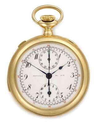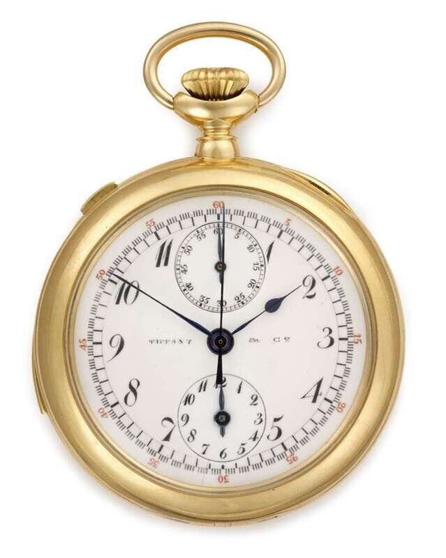 Circular open face case signed by Tiffany & Co. with serial 112354, white enamel face signed by Tiffany & Co., featuring Arabic numeral dial, outer minutes dial, subsidiary dials, minute repeating chronograph with stop second hand. Movement signed 'Patek Philippe'.