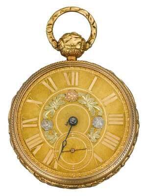 Circular open face case featuring tri color floral detailing, Roman numeral dial and subsidiary seconds dial. Inner case displaying english hallmarks, letter date for 1861, maker's marks 'TH' over 'JH'. Key wind movement signed by the maker, no. 23348.