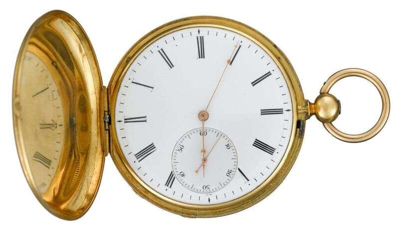 Circular hunting case, roman numeral and subsidiary seconds dials, inner case displaying London hallmarks and letter date for 1844, maker's mark 'EP', case no. 11076/16575, cuvette signed by the maker and retailer, key wind movement.