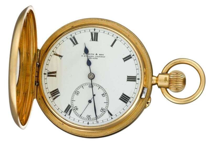 Circular semi open hunting case displaying outer Arabic numeral dial, white enamel face signed 'S. Smith & Son / 9 Strand, London / 190-458', displaying Roman numeral dial and subsidiary seconds dial, inner case marked 'AF', most likely for Alexander Field, with date letter for London 1829, case no. 25634, stem marked 'F.T', three-quarter plate gilt-finished movement signed by the maker with 'Makers to the Admiralty and the Indian government', no. 190-158 / 25634', movement also marked 'Especially good class A 881 marks'.