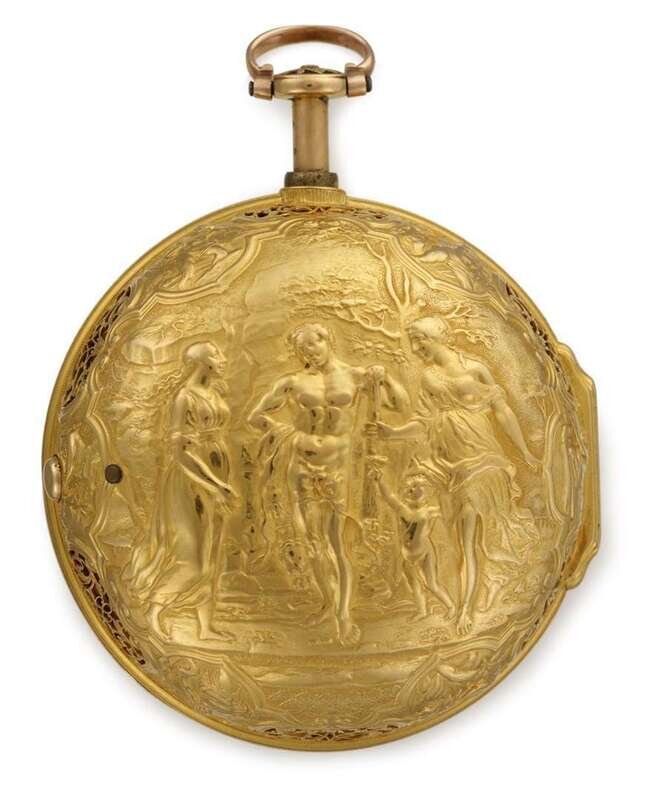 Circular pair case, outer case featuring high relief mythological scene of Hercules flanked by two female figures and Cupid, marked 'Parbury fecit', deep 'swing out' piecered inner case featuring bullseye lens, white enamel face displaying Roman numeral dial and outer Arabic numeral minutes dial, cylinder wind quarter-repeater a toc movement with diamond cap jewel, movement cover signed 'Sam Atkins, 1009', movement signed 'Atkins, 1009, London'.