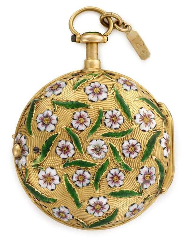 Circular 'swing out' case fearuting white daisies and green leaves in basse-taille low relief enameling, displaying French export hallmarks. White enamel face displaying Roman numeral dial and outer minutes dial. Key wind quarter-repeating a toc movement signed by the maker with no. 181. From collection of Captain Peter Belin, retains Captain Belin's 14 karat inventory tag, item 149. (Sotheby's London, 1979).