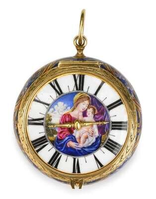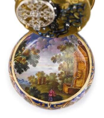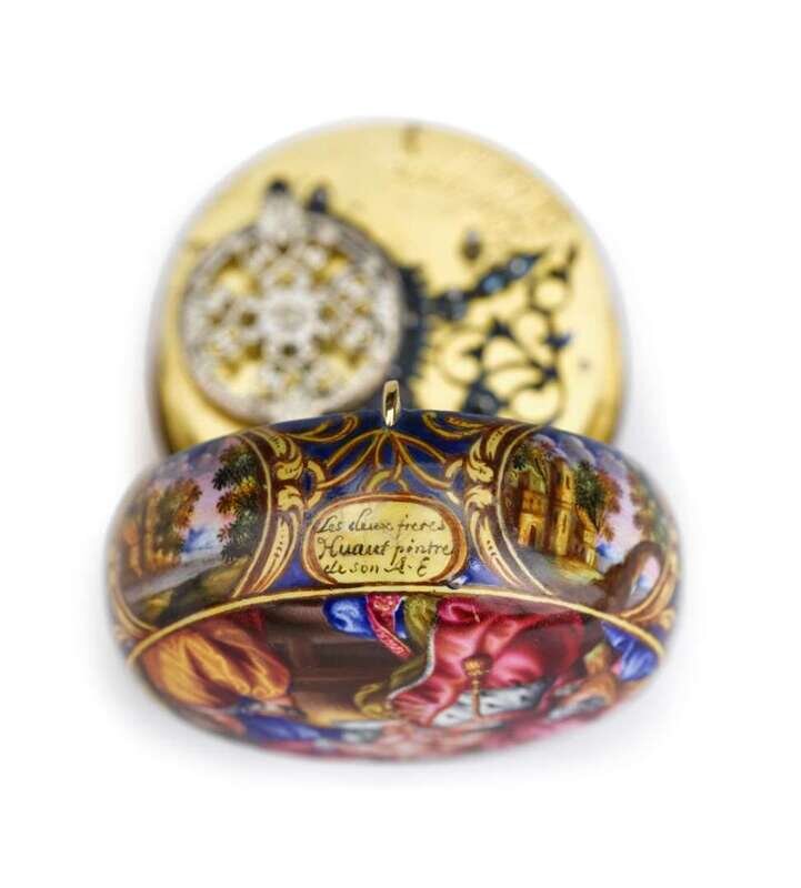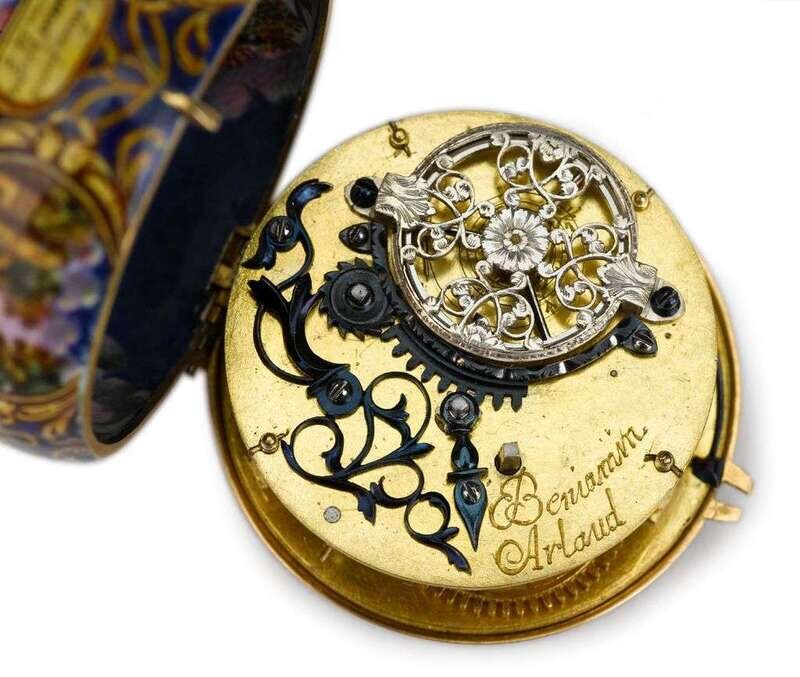 Rare 18 karat yellow gold highly enameled timepiece, Benjamin Arlaud, case by Les Duex Huaut Freres geneva, ca. 1686