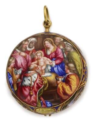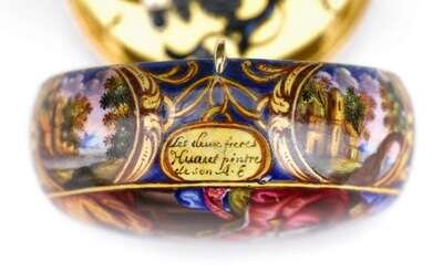 Highly enameled case and face. Reverse of case displaying 'Adoration of the Magi' scene, most likely after Peter Paul Rubens. Sides of case displaying four oval Swedish landscape vignette scenes, central oval signed 'Les Duex Freres Huaut Pintre De Son A.E.', face displaying Madonna and child in the round, framed by Roman numeral dial. Interior of case fully enameled, displaying landscape scene with figure and temple-like structure with fountain. Verge movement signed 'Benjamin Arlaud'.