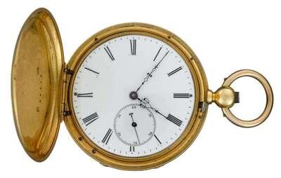 Circular hunting case, white enamel face displaying Roman numeral dial and subsidiary seconds dial, inner case no. 28312 with maker's mark 'M&B', cuvette signed by the maker, inner cuvette with same number, key wind movement signed 'Mermod Fres a Geneve'.