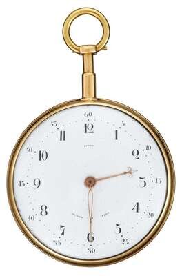 Circular open face, white enamel face signed by the maker with 'Invenit et Fecit', Arabic numeral hours and outer minutes dials, keyless quarter repeating cylinder movement with wolf's tooth train, no. 5538.