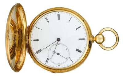 Circular hunting case, white enamel face displaying Roman numeral dial and subsidiary seconds dial, top of case no. 180, maker's mark 'MGJ', bottom of case displaying 'JJ' with crown over no. 5486. Key wind movement signed by the maker with 'Copenhagen'. Cuvette signed by the maker with no. 5488. Inner case engraved 'Richard Taylor 1845'. Front of case featuring an arm holding an arrow.