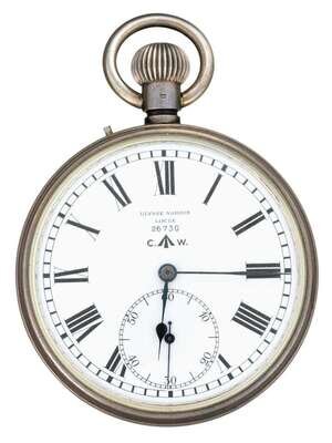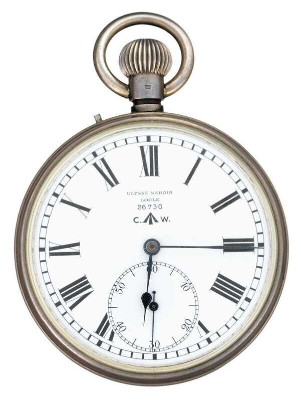 Circular open face displaying Roman numeral dial, subsidiary seconds dial, face signed by the maker 'Ulysse Nardin, Locle, 26730, CW', stem displaying hallmark. Reverse of case marked 'H.S. (arrow) 2'. Accompanied by box.