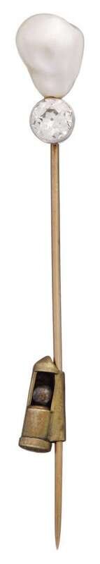Platinum topped yellow gold natural pearl and diamond stick pin