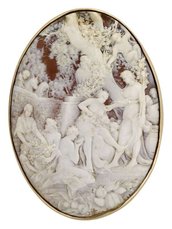 Carved shell cameo featuring female pastoral scene.