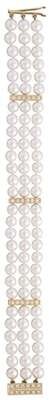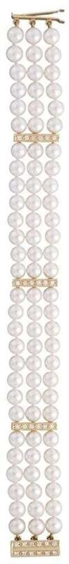 Three strand cultured pearl bracelet, pearls approximately 5.6 mm. Three spacers and clasp accented by petite round cut diamonds, approximately 0.60 carat total weight. Displaying maker's mark.
