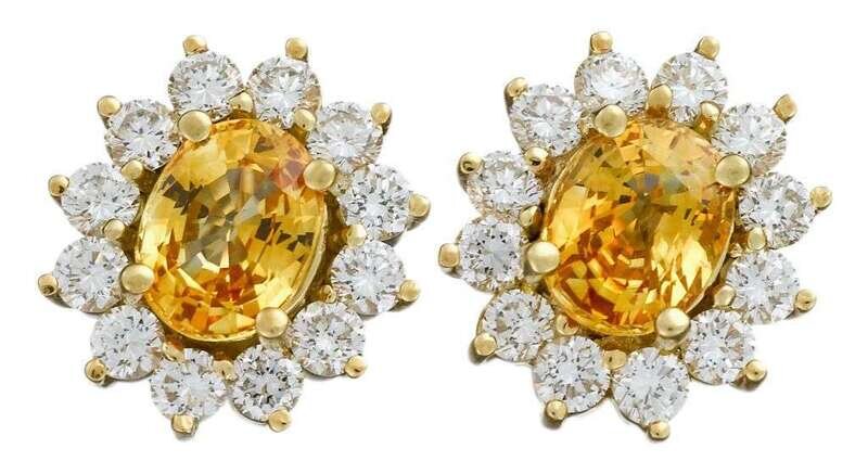 Oval cut yellow sapphires, approximately 3.17 carat total weight. Surrounded by twelve round cut diamonds, total diamond weight for both earrings, approximately 1.32 carats. French post and omega backs.