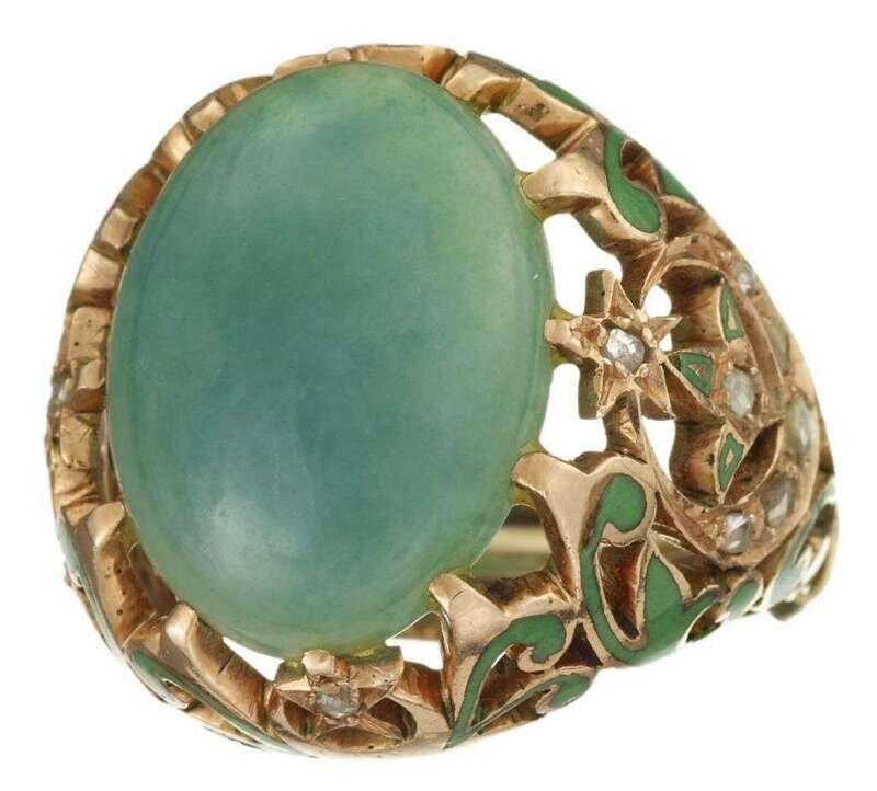 18 karat rose gold jade, diamond and enamel ring