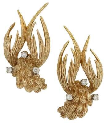 Textured gold, accented by three petite round cut diamonds. French post and omega backs. Displaying unidentified maker's mark.