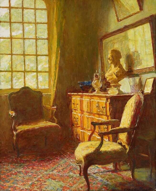 OCTAVE DENIS VICTOR GUILLONNET (FRENCH 1872-1967) SITTING ROOM INTERIOR WITH PAIR FAUTEUILS