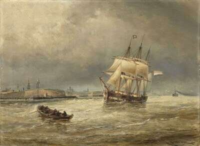 CORNELIS CHRISTIAAN DOMMERSEN (DUTCH 1842-1928) "VLISSINGUE - ENTRANCE TO THE SCHELDE; A THREE MASTED MERCHANT SHIP TAKING IN THEIR PILOT"