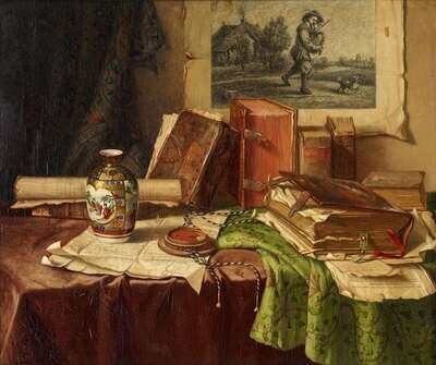 AUSTRIAN SCHOOL (LATE 19TH/EARLY 20TH CENTURY) TABLETOP STILL LIFE WITH WAX SEAL, BOOKS AND ORIENTAL VASE