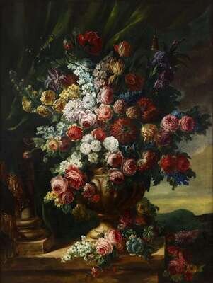CONTINENTAL SCHOOL (19TH CENTURY) MIXED FLOWERS IN AN URN; LANDSCAPE BEYOND