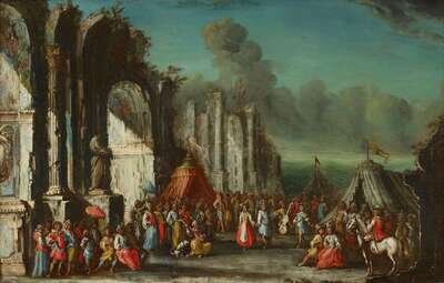 ATTRIBUTED TO GHERARDO POLI AND GIUSEPPE POLI (ITALIAN C. 1680-1739) & (ITALIAN 1700-1767) CAPRICCIO OF A TOWN WITH ELEGANT FIGURES AND TENTS: A MARRIAGE SCENE