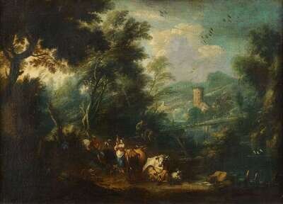 FOLLOWER OF KAREL DUJARDIN (DUTCH 1626-1678) DROVER AND SHEPHERDESS WITH CATTLE IN A LANDSCAPE
