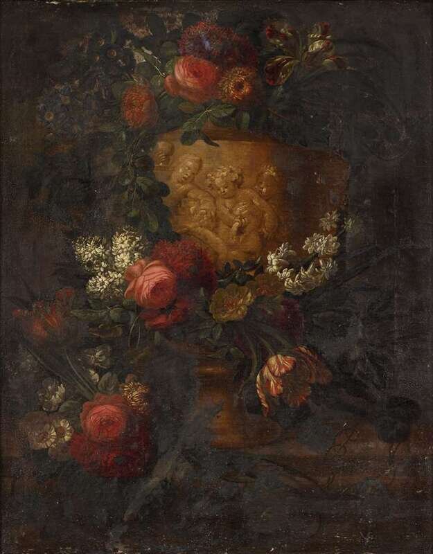JAN-BAPTISTE BOSSCHAERT (FLEMISH 1667-C.1746) MIXED FLOWERS IN A SCULPTED STONE URN UPON A LEDGE