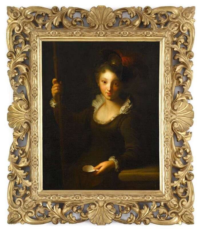 AFTER ALEXIS GRIMOU (SWISS 1678-1733) PORTRAIT OF A GIRL, THREE-QUARTER LENGTH, DRESSED AS A PILGRIM