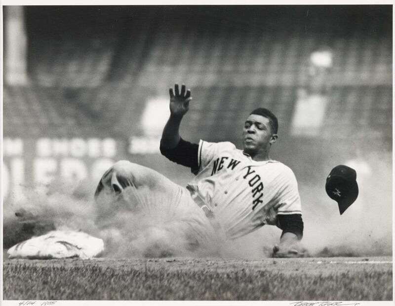 ROBERT RIGER (AMERICAN, 1924-1995) WILLIE MAYS, NEW YORK GIANTS, TRIPLES IN EBBETS FIELD