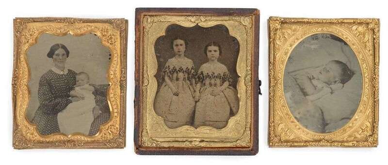 Ninth to whole plate tintypes and ambrotypes depicting men, women, and children in various poses, including one post-mortem portrait. Some with handcoloring. Some with partial cases.