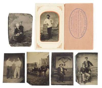Approximately 75 tintypes ranging from stamp size to whole plate, depicting children, couples, families, horse drawn wagons and seaside scenes. Some handcolored.