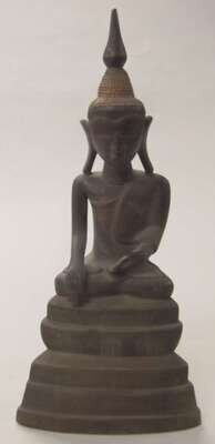 A figure of Buddha seated in dhyanasana on a molded throne, his hands in bhumisarsa and dhyana mudra, wearing a monastic robe.