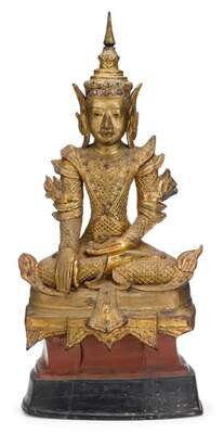 The figure of Shakyamuni seated in dhyana mudra and wearing royal robes and a crown.