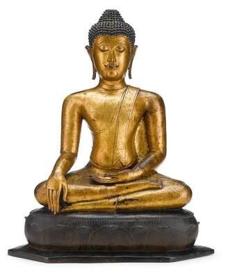Buddha Shakyamuni seated in dhyasanaon a wood base, face in a meditative expression.