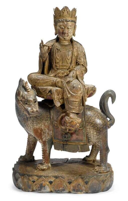 Important Chinese polychrome wood figure of Ksitigarbha bodhisattva on Unicorn Beast ming dynasty