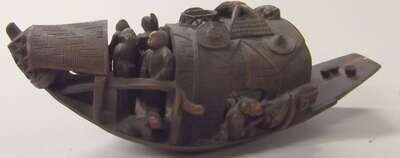 The carved model depicting four figures to the rear of the vessel while two operaters are seen out the starboard side, accompanied by various cargo and a small animal on the roof.