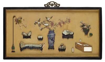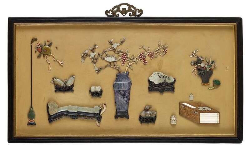 Large and fine Chinese jade, gilt-metal and semi-precious stone mounted wall panel 18/19th century elements