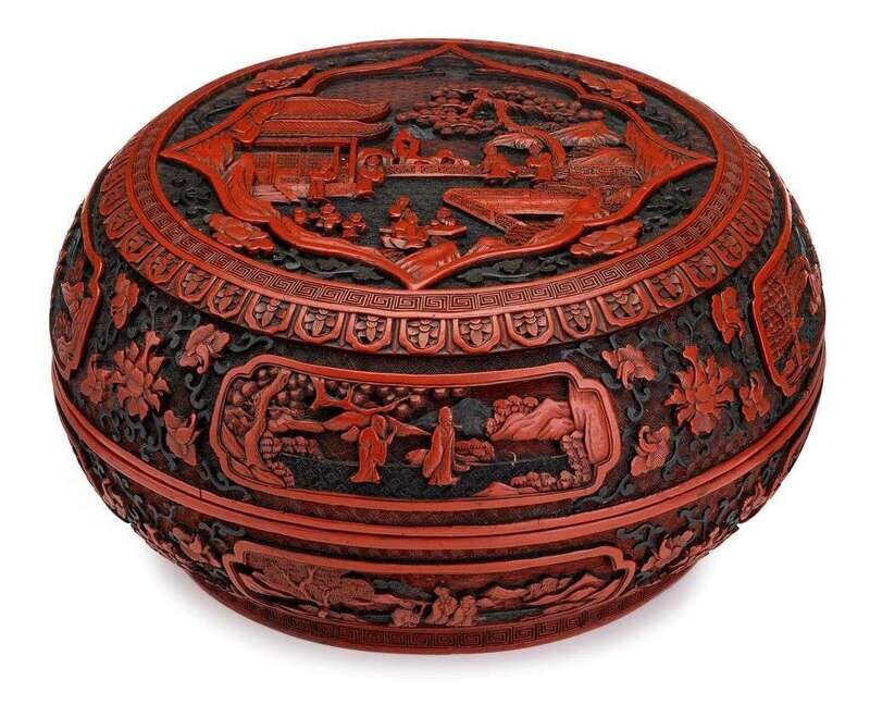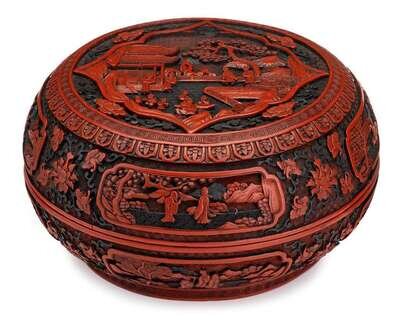 Domed cover carved to show central cartouche of figural landscape within Greek-key, similar oval scenes to rim, over conforming base.