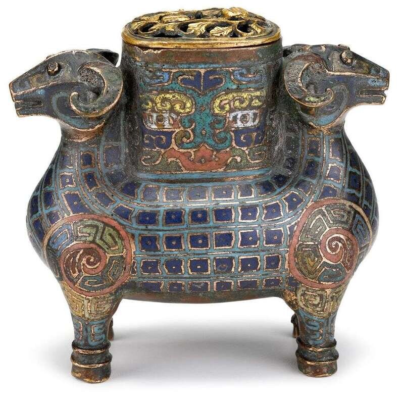 Chinese cloisonne enamel 'double ram' covered censer, zun ming dynasty