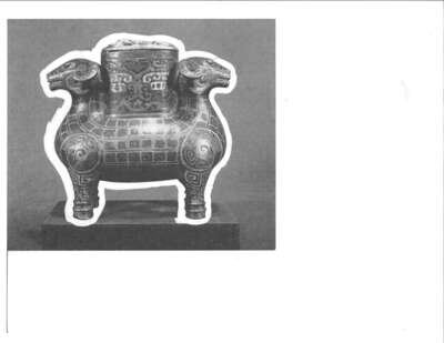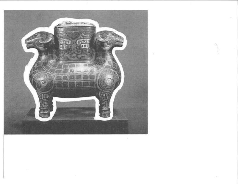Moulded in the form of double rams facing opposite directions, supporting an oblong censer neck on their backs between the heads, standing on four feet.