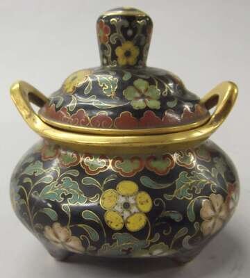 Tapering legs, globular body, short waisted neck highlighted by everted gilt rim and loop handles, surmoutned by a tiered cover with yinyang knob.