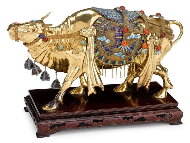 Large Chinese gilt-silver and enamel stone mounted model of a Buffalo stamped