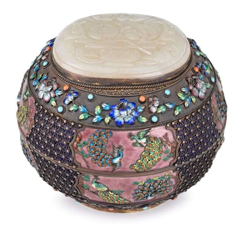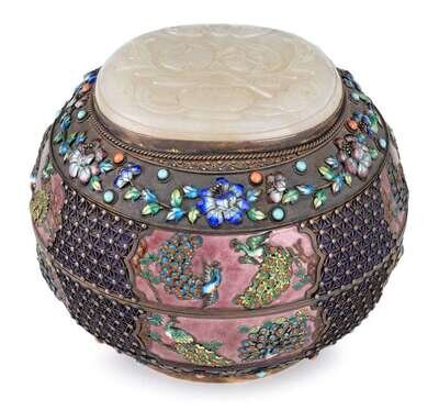 Repousse silver enameled with phoenix, flowers and inset hardstone, the top with large oblog white jade plaque, "silver" mark to base.