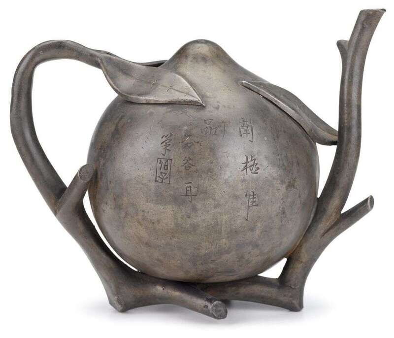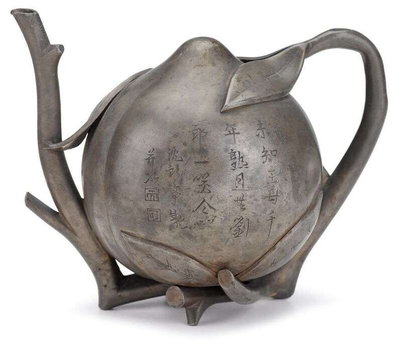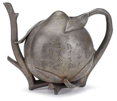 In the form of a peach with leaves moulded into the body of the vessel and a branch-like spout, ligntly inscribed to both sides with poems signed and marked by Shen Langting and Shi Gu.