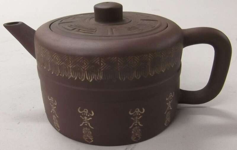 Barrel shaped, the cover molded with Shou symbols and the body further incised with patterns and Shou characters; the base bears a pictorial mark.