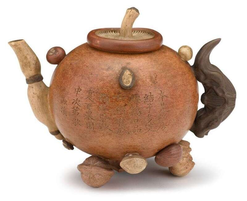 Shaped as a pomegranate, with fungus, nuts, mushroom and lotus root as handle, cover and spout, incised with poem in praise for the abundance of food, signed Song Xi with a Chun Ping mark near base.