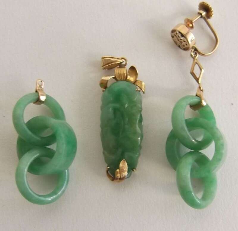 Chinese 14k yellow gold mounted jadeite pendant and pair of earrings