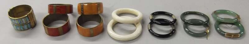 Including three ivory, four celadon jadeite, two black hardstone, four stained wood and one inlaid albalone bracelet.